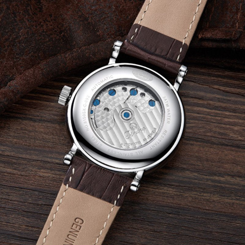 Discover the elegance of the TIMING Classic Mechanical Watch 8150SX-C, featuring a sleek stainless steel case and a sophisticated white dial. Powered by an automatic movement with dual balance wheels, this watch offers exceptional accuracy and reliability. The scratch-resistant mineral glass ensures long-lasting protection for the dial, while the durable 316L stainless steel case adds a refined, modern touch. A comfortable genuine leather strap completes the look, making it ideal for both casual and formal occasions. With 3ATM water resistance and backed by a two-year warranty, this mechanical watch is the perfect choice for those who appreciate precision, style, and craftsmanship. |