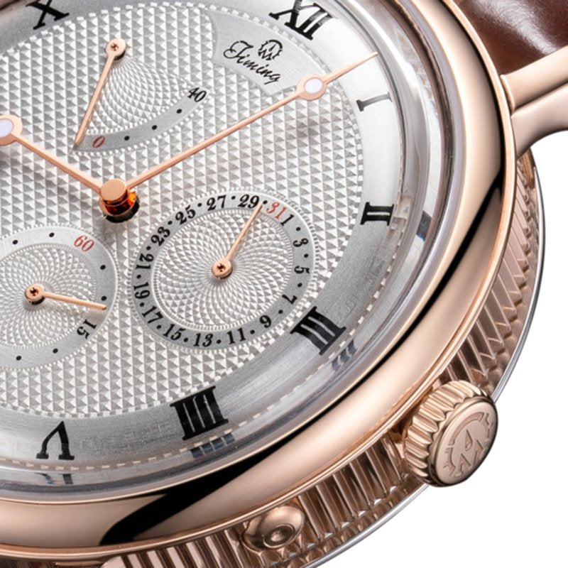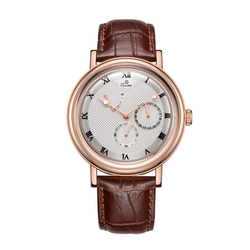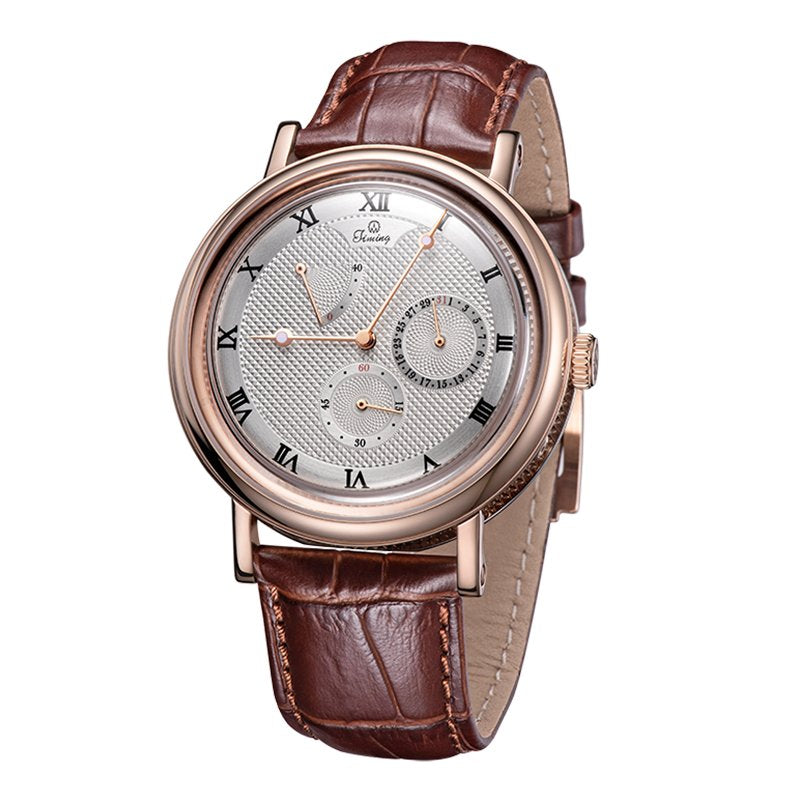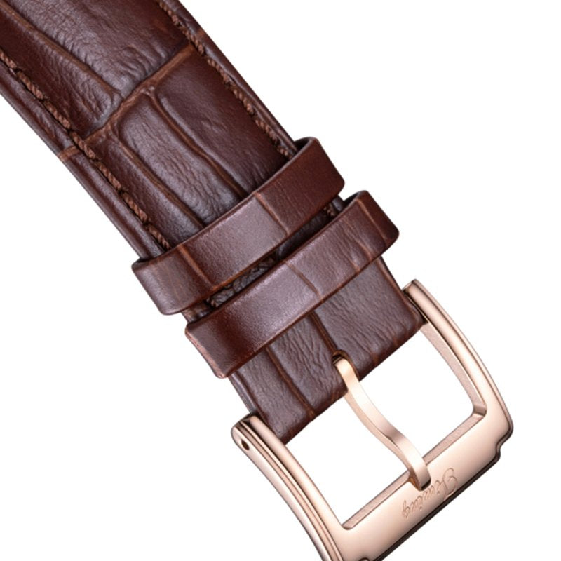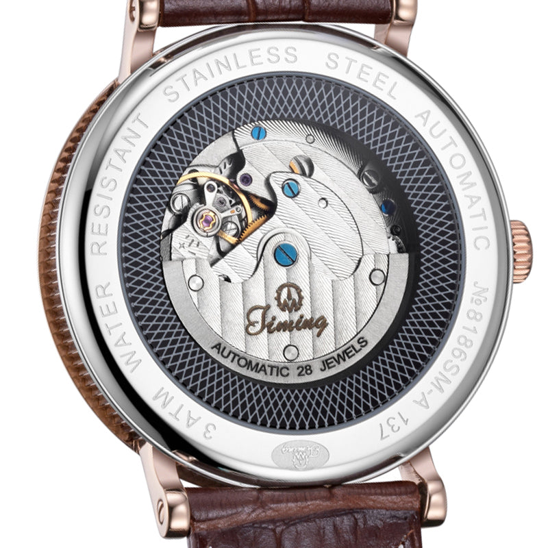 Introducing the Timing Classic Men's Watch 8186SM-A, a captivating blend of vintage style and modern sophistication. This exquisite timepiece features a classic design with Roman numeral hour markers and a stunning rose gold dial, complete with a unique date display that adds elegance to your wrist. The brown leather strap perfectly complements the rose gold case, making it an ideal accessory for formal occasions. Equipped with an automatic mechanical movement and a durable mineral glass face, this watch ensures reliable timekeeping while boasting a premium 316L stainless steel case. Rated at 3ATM water resistance and backed by a two-year warranty, it is the perfect choice for the discerning gentleman. |