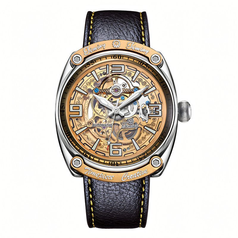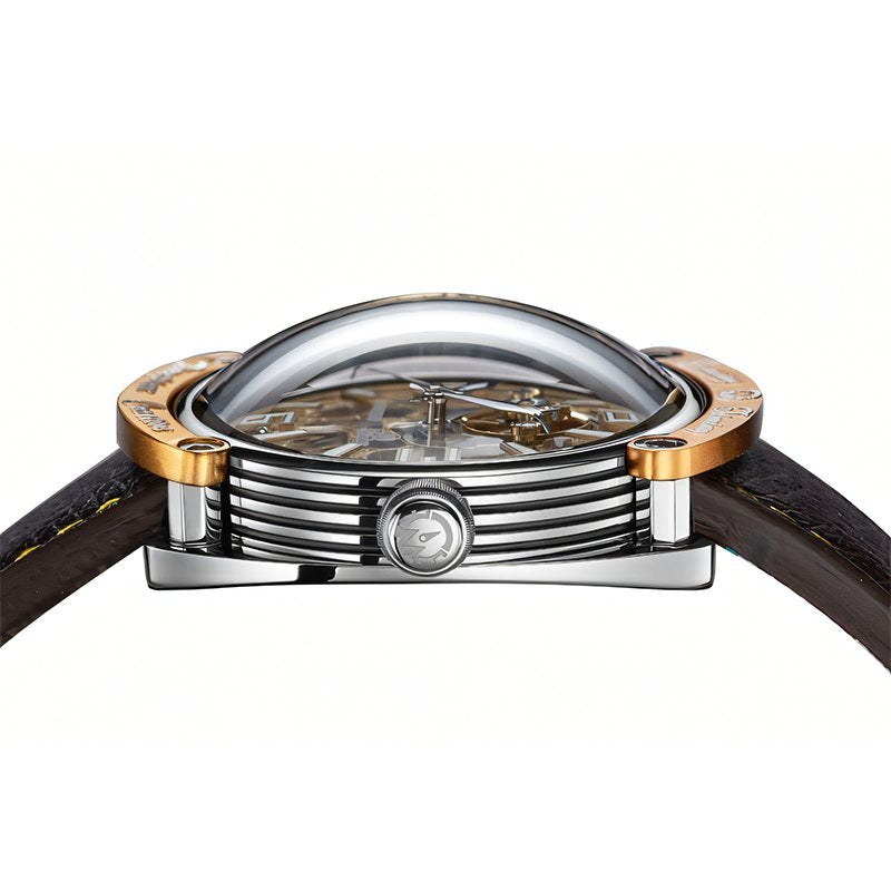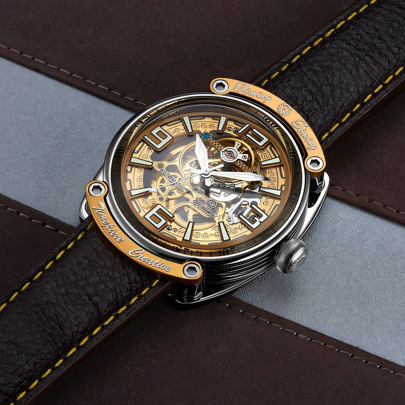 Timing Interstellar Series Watch - Galactic Voyage Explore the vast cosmos, from stargazing to viewing the world from above; the Timing Interstellar Series Watch offers a groundbreaking visual experience. This timepiece features a unique spherical crystal design, reminiscent of a glimmer of blue light from the depths of space, bringing a futuristic aesthetic to watch enthusiasts and collectors alike. The blue nameplate and skeleton movement complement each other, resembling a mysterious time machine drifting in infinite space, with the passage of time on the dial adding an extra layer of intrigue and wonder. The intricate mechanical structure of the Interstellar Series creates a mesmerizing, self-contained universe within the watch case. Through the sapphire crystal case back, the precise mechanisms and mercury-like dial are fully visible, with sharp hands and minimalist hour markers enhancing its avant-garde artistry. The flow of time unfolds like a celestial display, as if night itself is gradually descending. The clean lines and dynamic design strike a perfect balance between elegance and energy. The watch lugs feature crisp, angular cut lines that showcase Timing’s masterful craftsmanship, while the circular chronograph buttons and spiral crown emphasize functionality and reflect the brand's dedication to practical design. As an innovative work in Timing’s lineup, the Interstellar Series not only draws inspiration from and refines classic design styles but also infuses modern cultural elements and a fresh aesthetic vision, inviting wearers to embark on a cosmic journey with every glance at their wrist. |