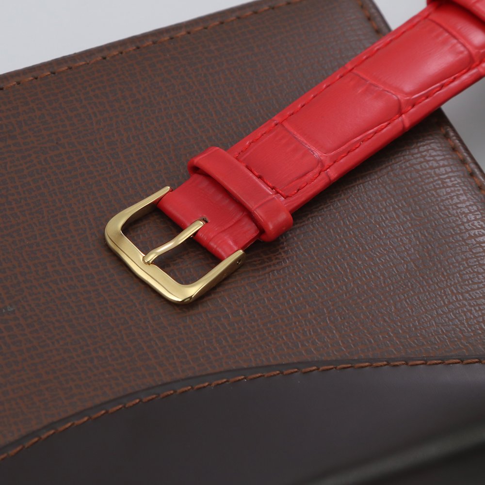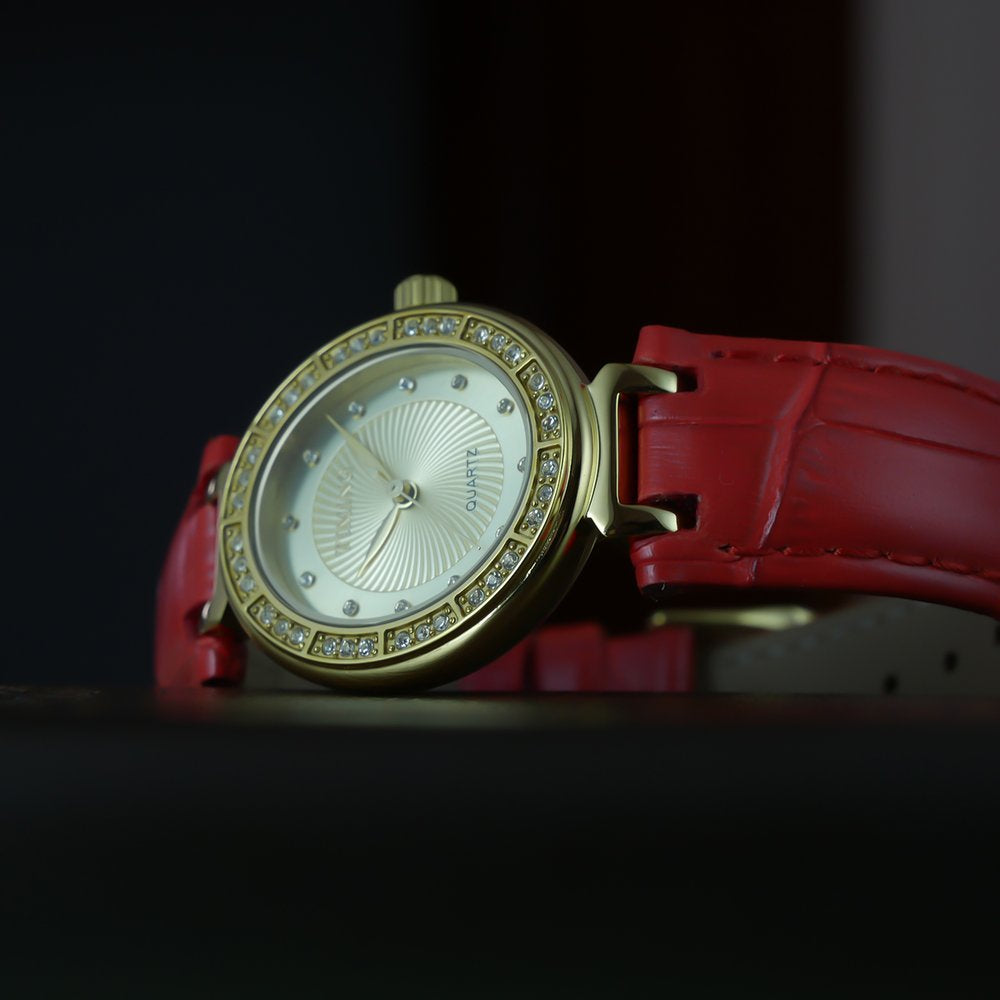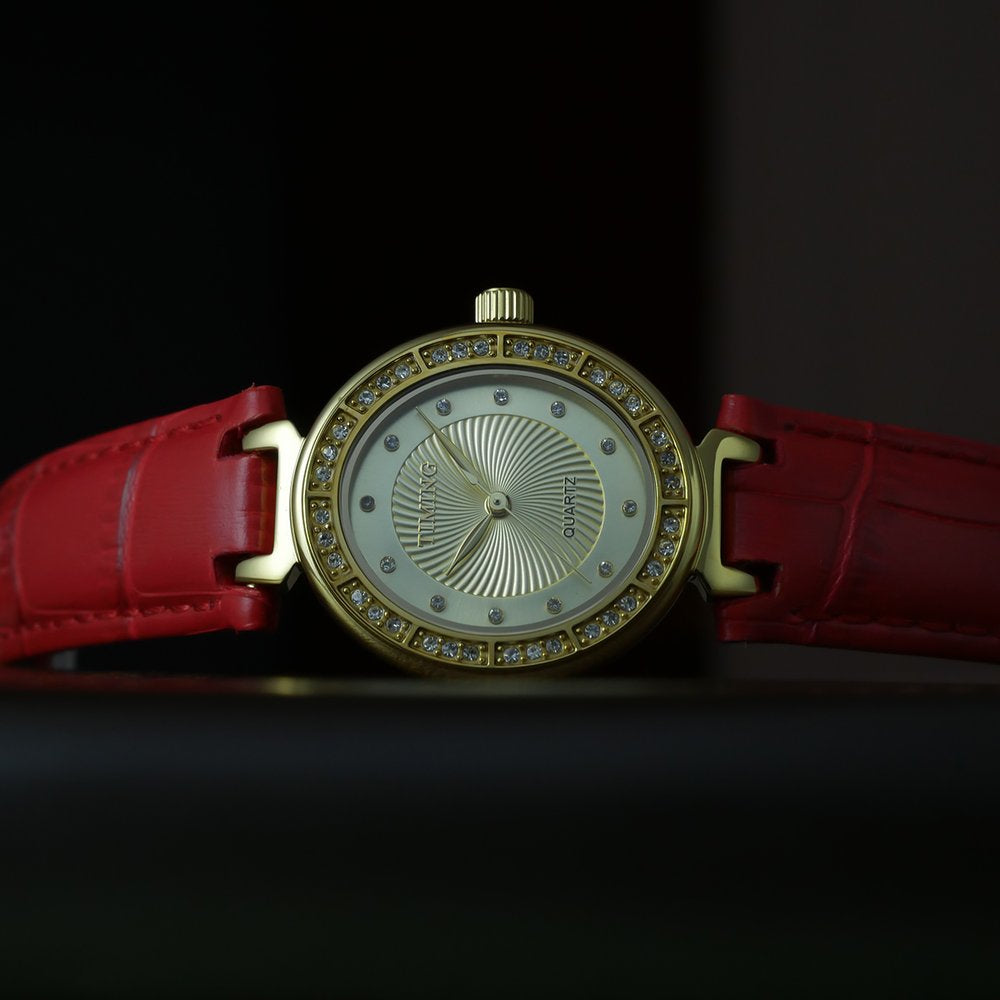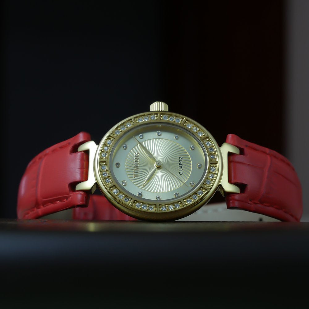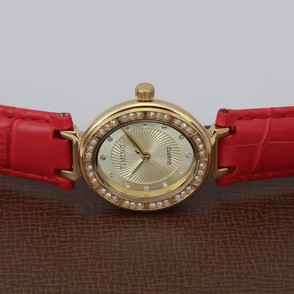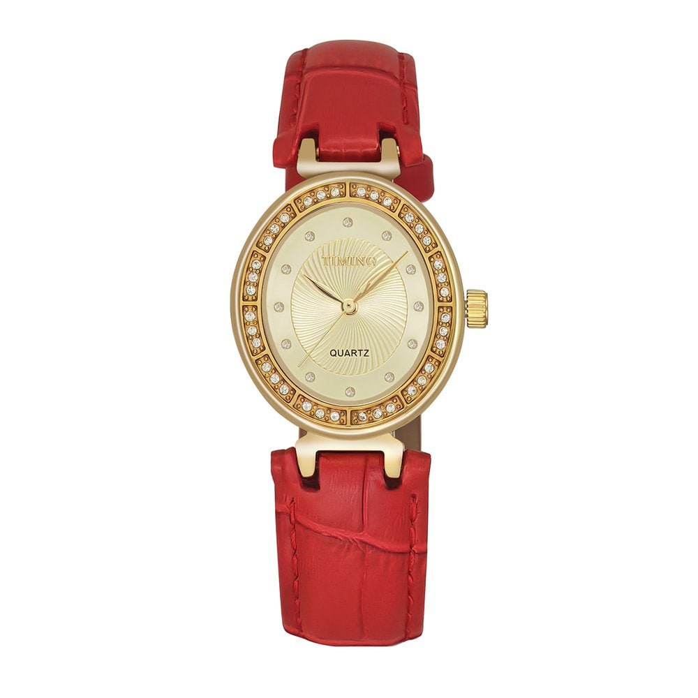 This women's quartz watch by TIMING features a sophisticated oval design with a gold-tone stainless steel case. The dial is protected by durable mineral glass and framed by a sparkling zirconia bezel. The vibrant red leather strap enhances its stylish appearance. This watch combines both elegance and functionality with 3ATM water resistance, making it a perfect choice for daily wear. |