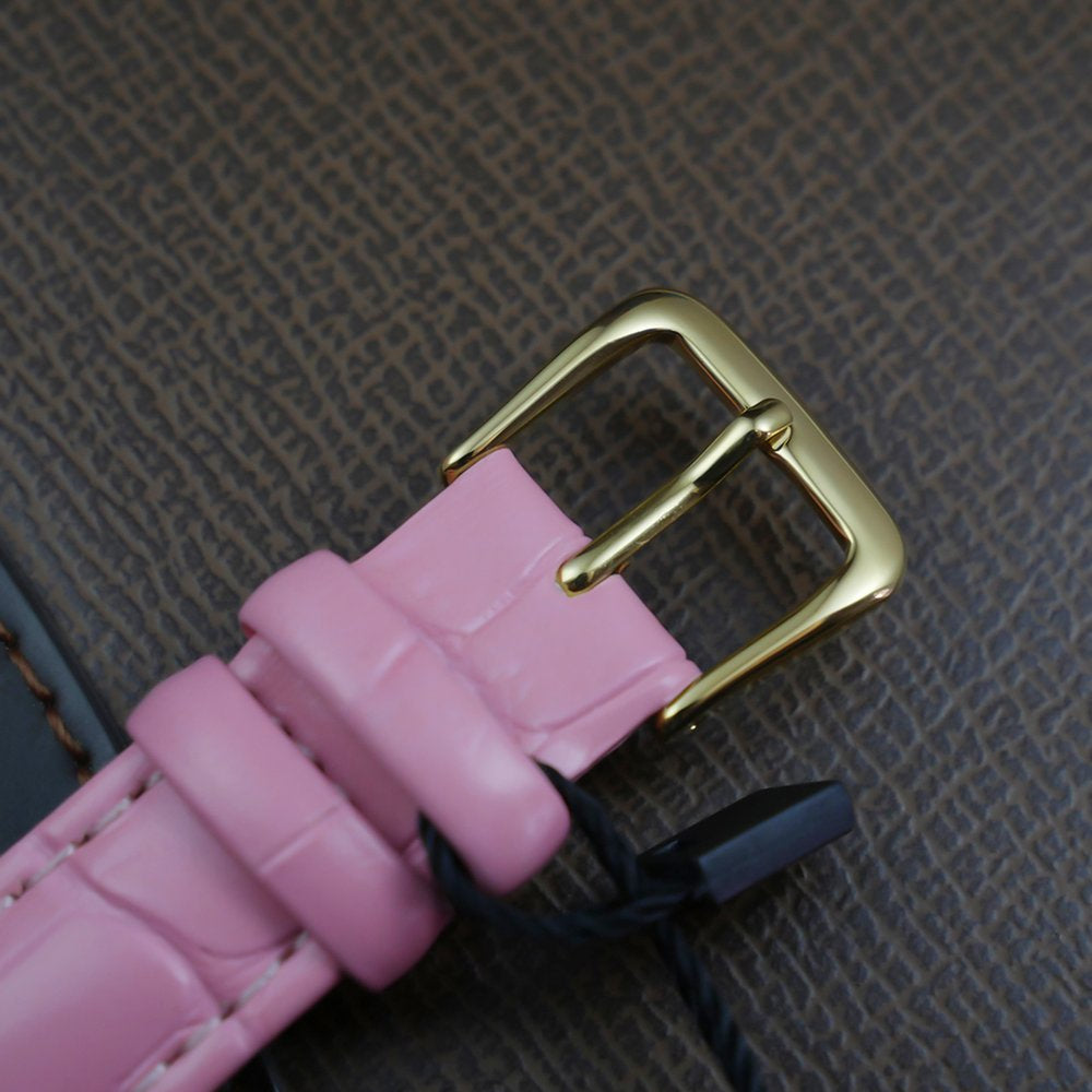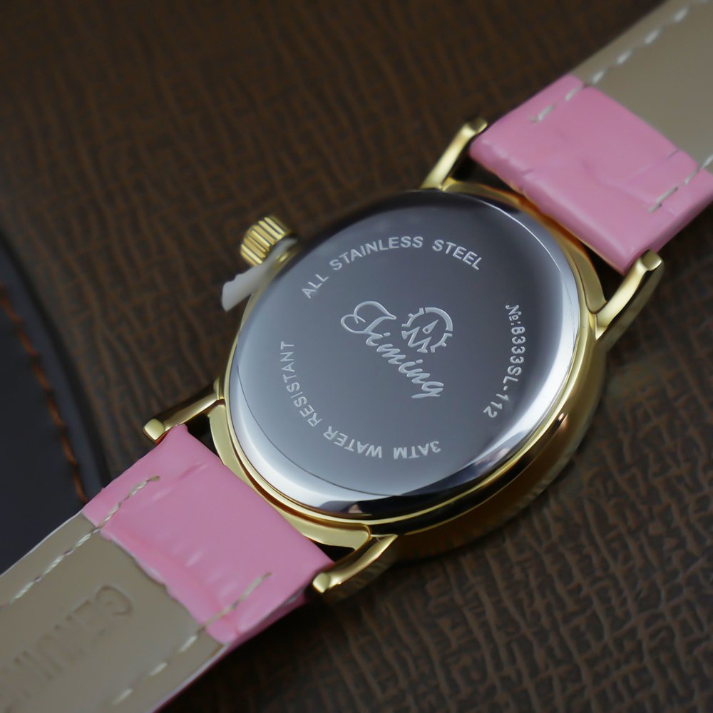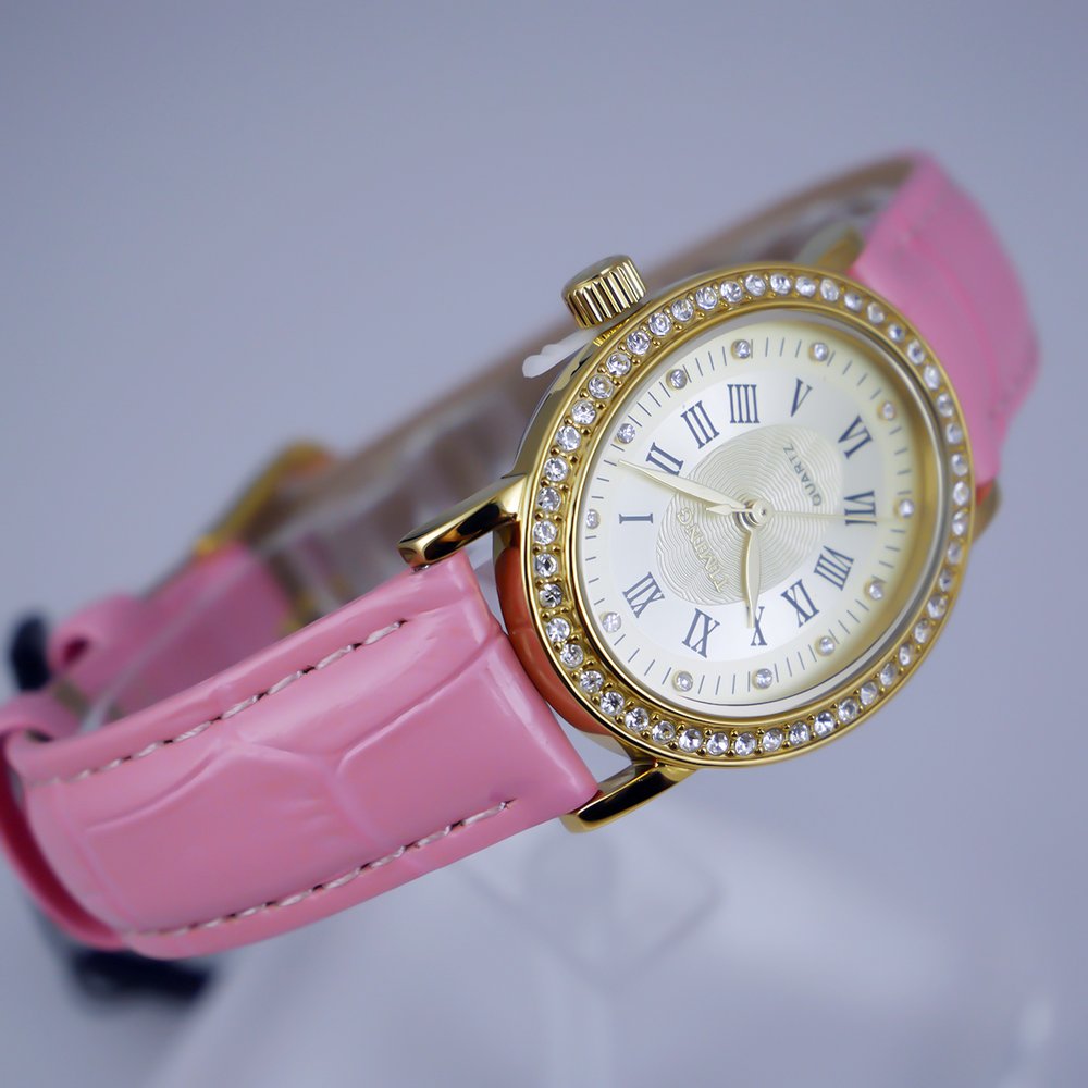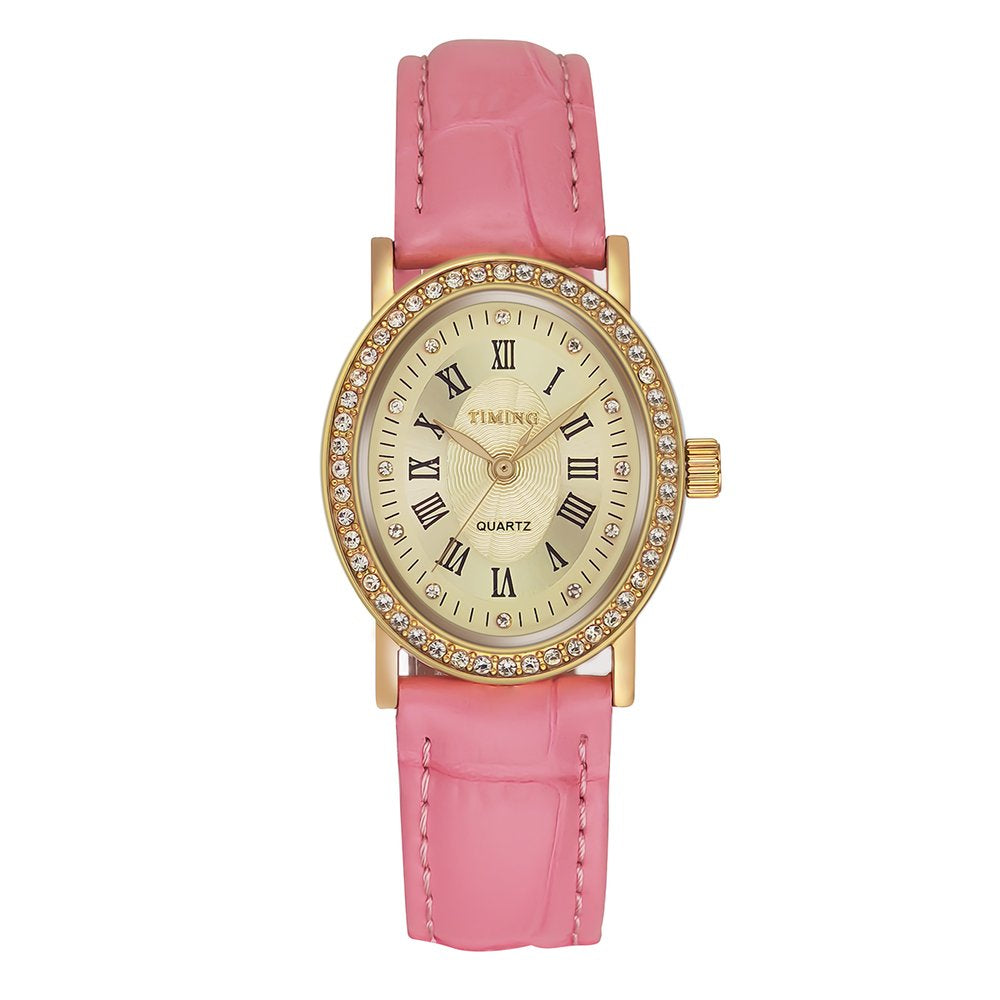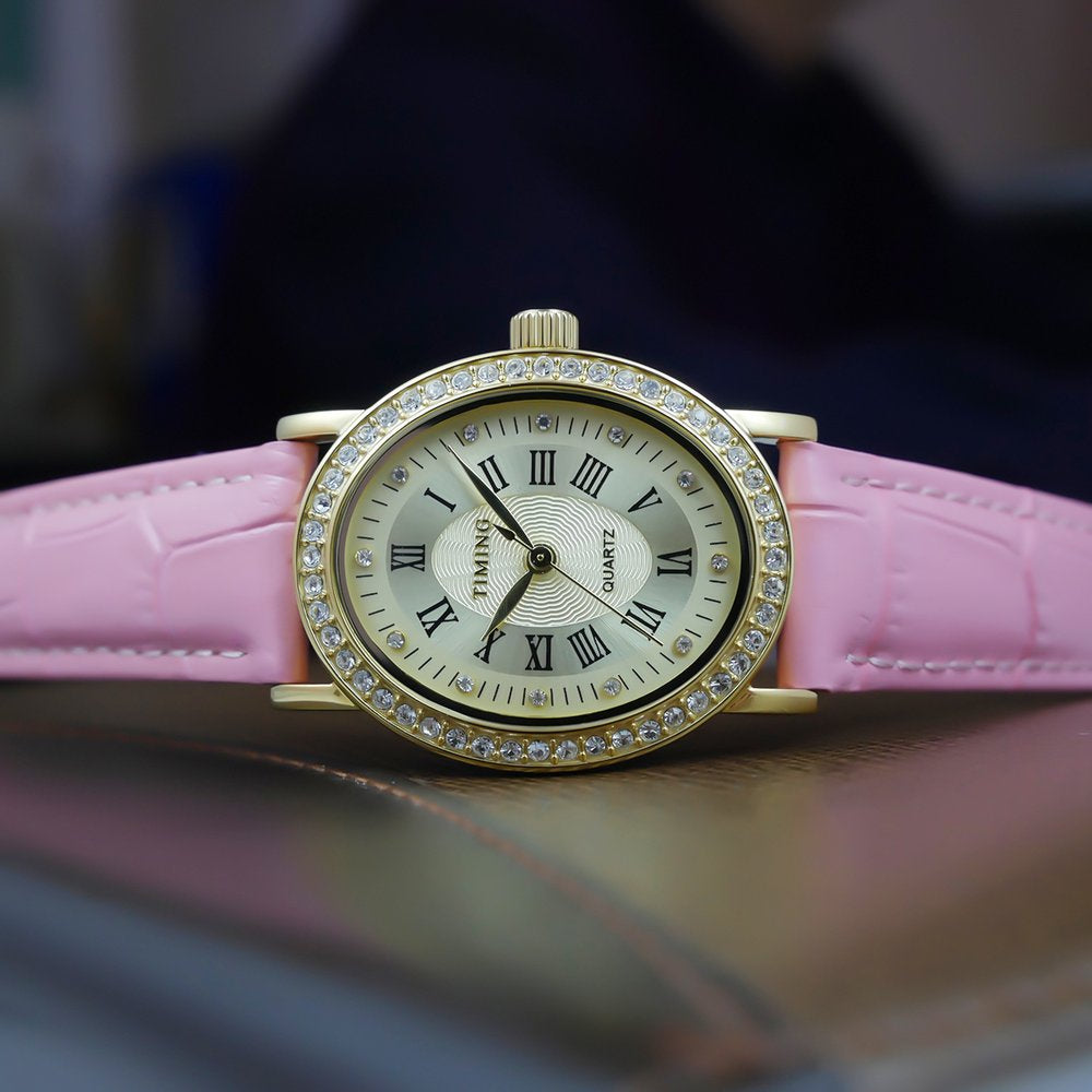 This women's quartz watch by TIMING combines elegance and functionality with its oval gold-tone stainless steel case and sparkling zirconia-encrusted bezel. The dial is protected by strong mineral glass, while the soft pink leather strap ensures a comfortable fit. With a 3ATM water resistance rating, this watch is both a stylish and practical accessory for everyday wear. |