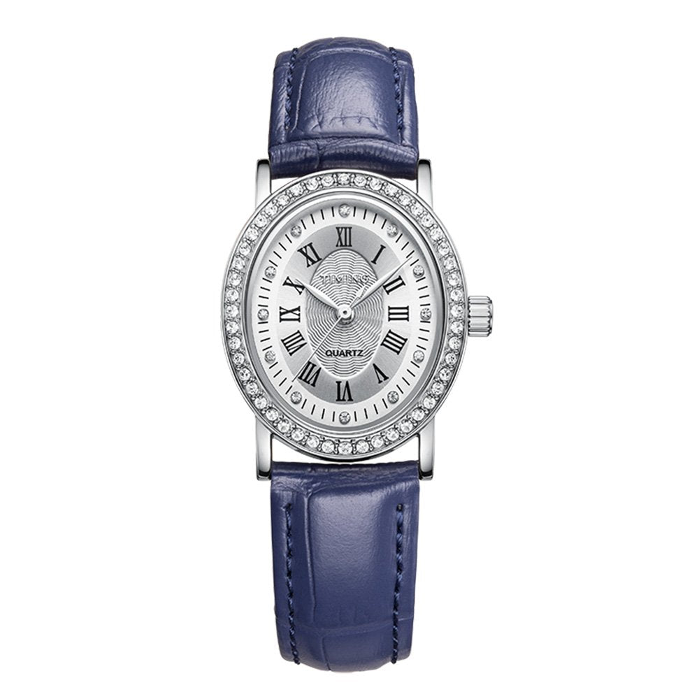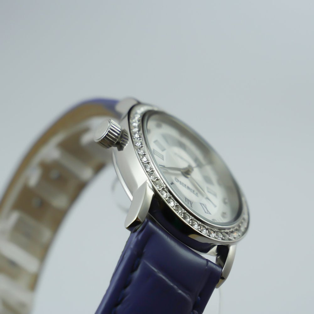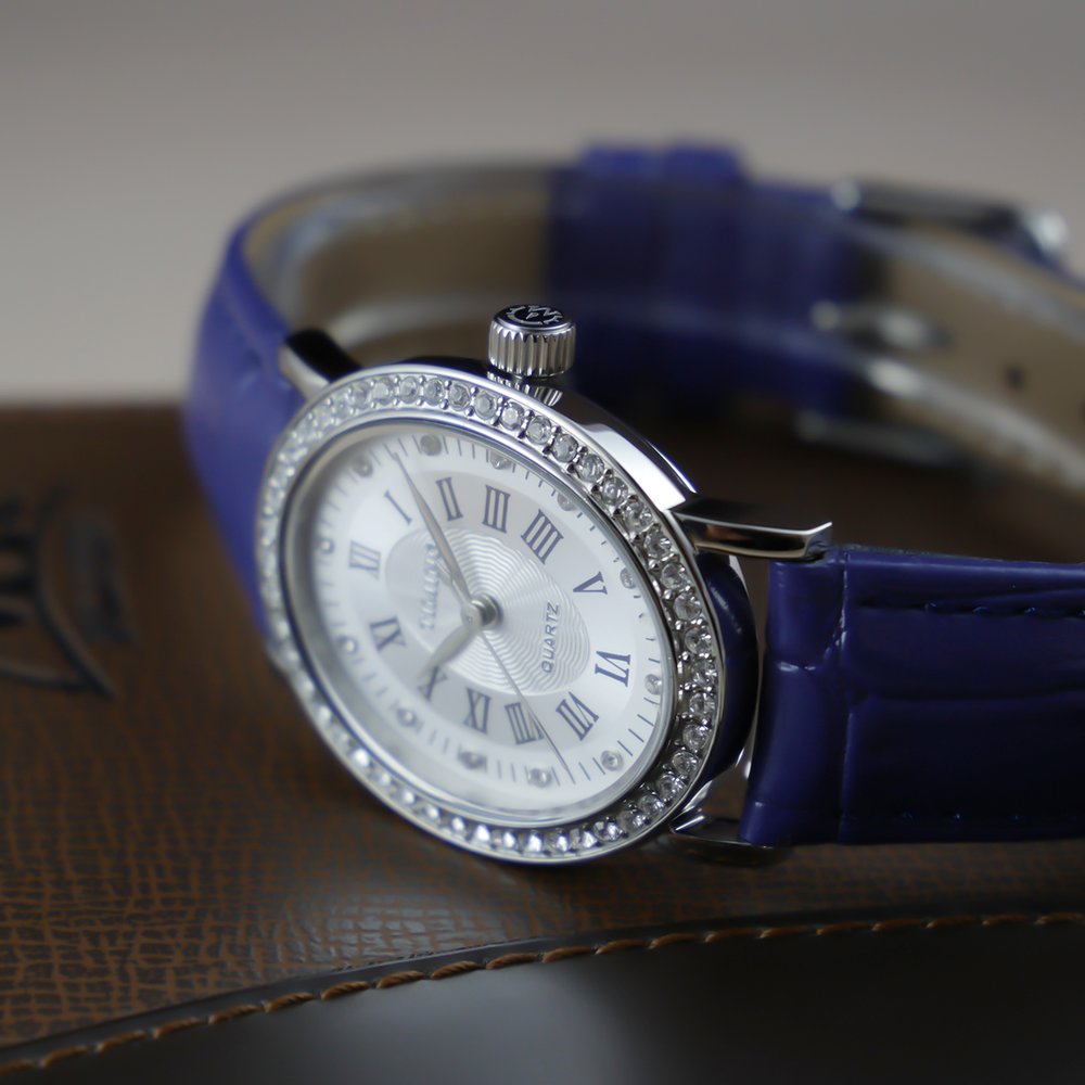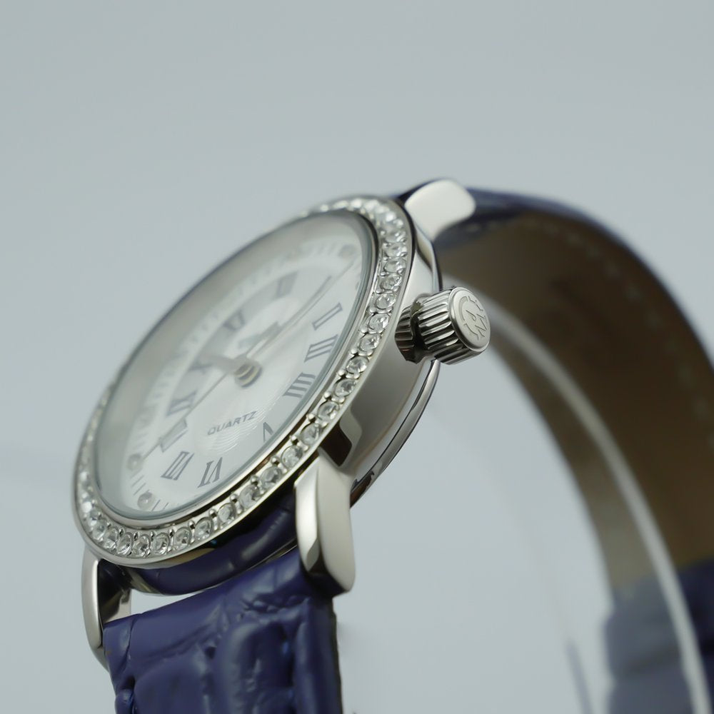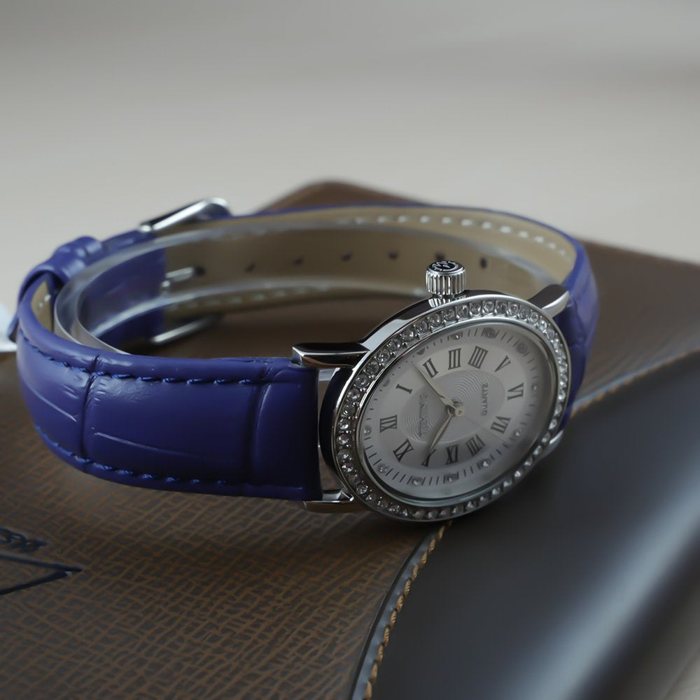 This TIMING women’s quartz watch combines timeless style with modern elegance. The silver-tone stainless steel case, paired with a blue leather strap, creates a sophisticated look, while the sparkling zirconia-encrusted bezel adds a touch of luxury. With a durable mineral glass and a 3ATM water resistance rating, this watch is both functional and fashionable for daily wear. |