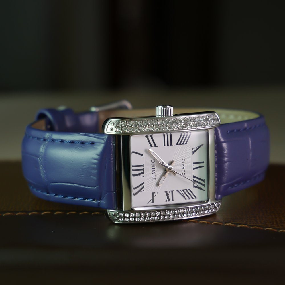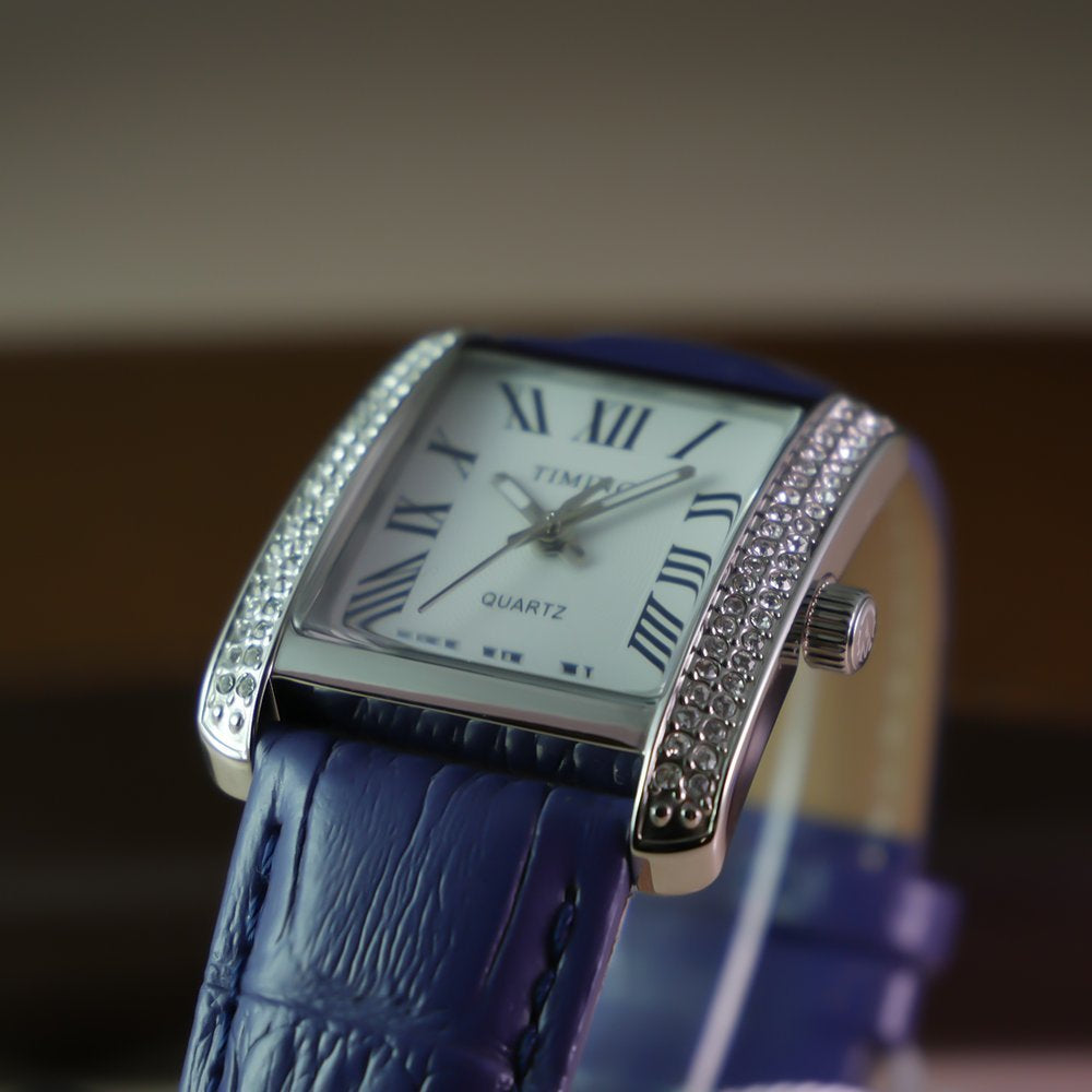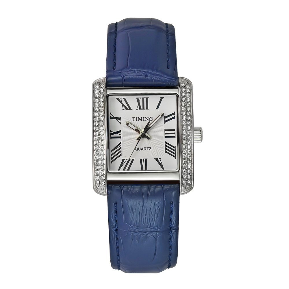 This TIMING women's quartz watch combines elegance with practicality. Featuring a square silver-tone stainless steel case and a vibrant blue leather strap, it brings a chic yet timeless style to any outfit. The sparkling zirconia bezel enhances its sophisticated look, while the durable mineral glass and 3ATM water resistance make it suitable for daily use. A perfect choice for those seeking a fashionable and functional accessory. |